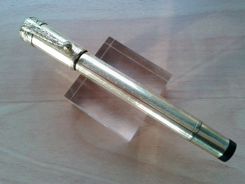Photo of a pen produced by Standard. Filling system: button filler. With geometric pattern gold rolled overlay. Detail of cap. Unidentified model.