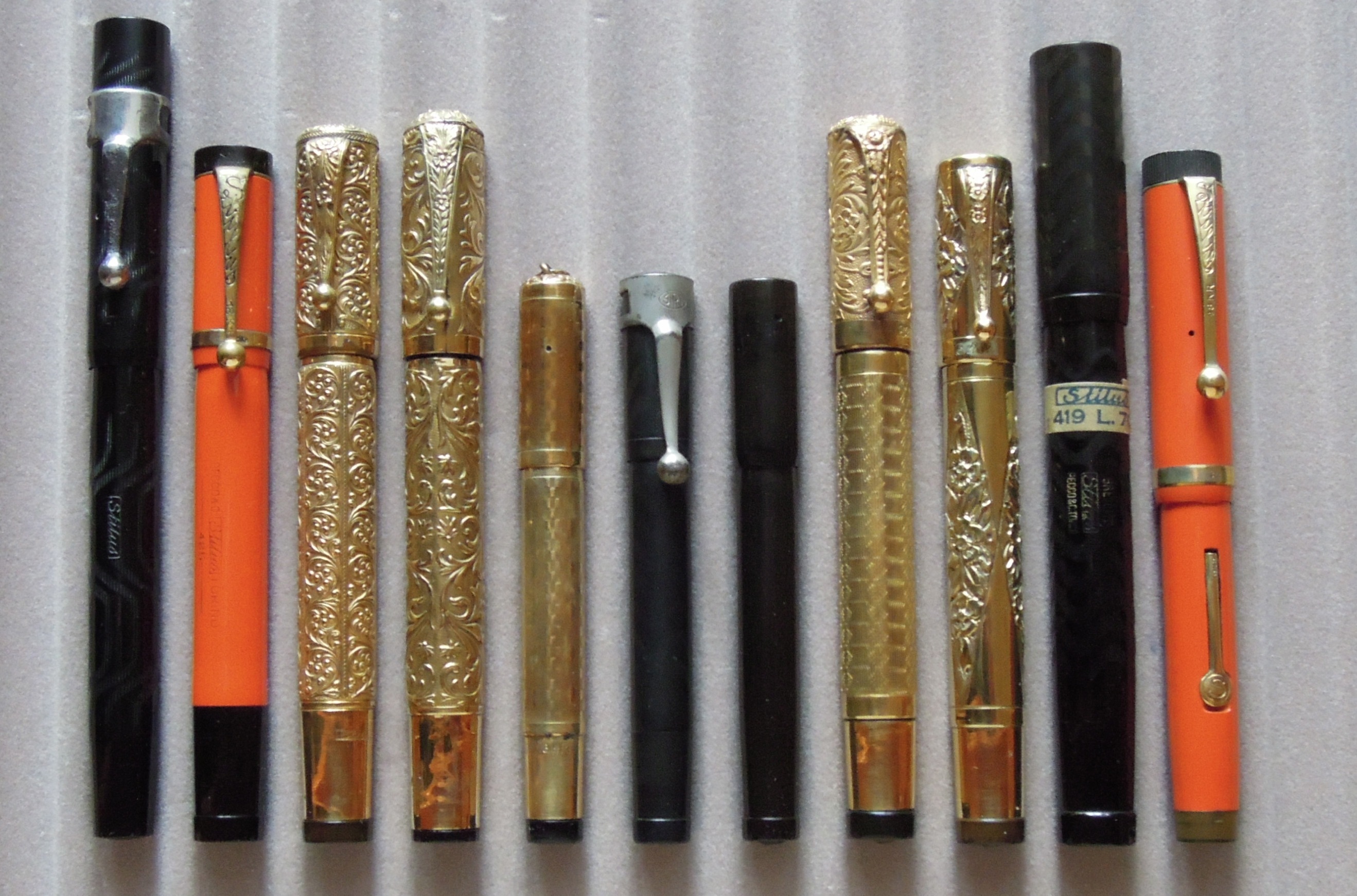 Photo of a series of pens produced by Stilus. Filling system: button filler. Series of early production pens; from left to right: