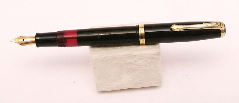 Photo of a pen produced by Osmia. Model: Supra Progress 194. Filling system: vacumatic-like. In black chased celluloid. Normal (?) size.