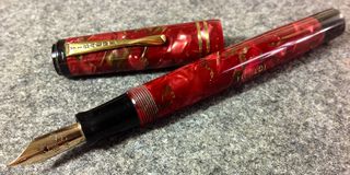 Foto di una penna Tibaldi marcata "Tibaldi Firenze". Modello: Infrangibile. Caricamento a pulsante di fondo. Realizzazione in celluloide rossa screziata verde-oro. Modello identico alla Internazionale, ma marcata Tibaldi Firenze. Contributo di Giorgio (utente forum Musicus).