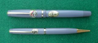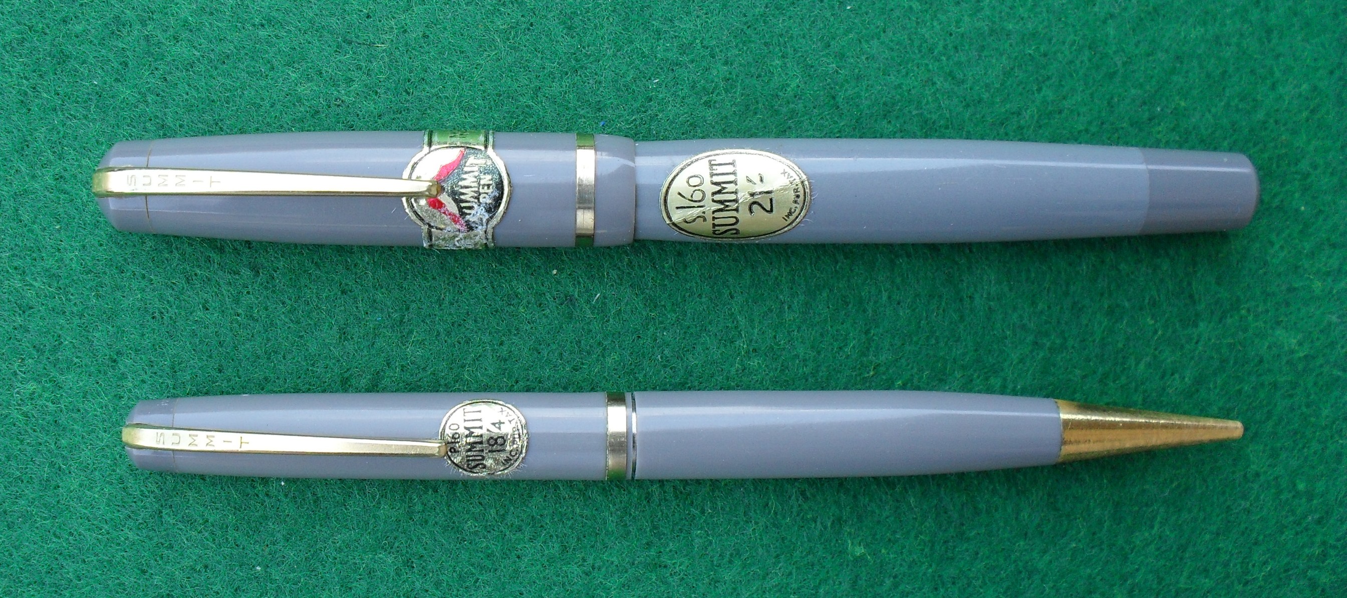 Photo of a pen/pencil set produced by Summit (a Lang - Curzon - Summit trademark). Model: Summit S.170. Filling system: button filler. In smooth gray plastic resin. Model called Crest. Complete of price stickers, box and documents.