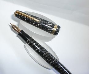 Photo of a pen produced by Titania. Filling system: button filler. In ringed gray celluloid. Unidentified model.