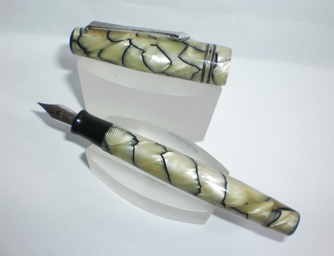 Foto di una penna Ausonia. Caricamento a pulsante di fondo. Realizzazione in celluloide perla a venature nere. Modello ignoto. Contributo di Fabrizio Falchi, (utente forum fountainpen.it fab66).