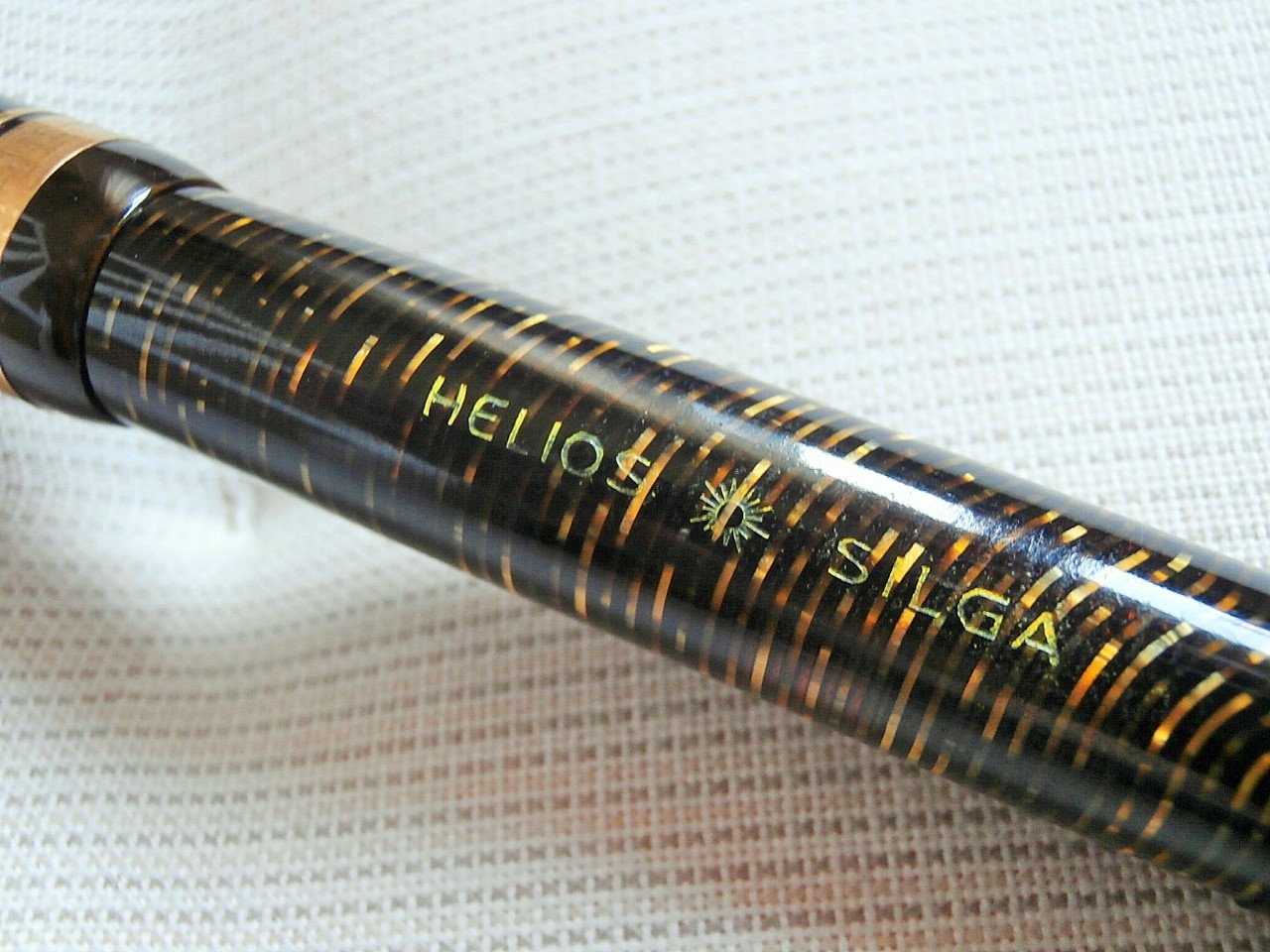 Photo of a pen produced by Helios marked "Helios - Silga". Filling system: piston filler. In ringed celluloid. Detail of inscription. Unidentified model, resembling Vacumatic.