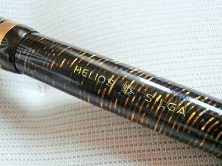 Foto di una penna Helios marcata "Helios - Silga". Caricamento a stantuffo. Realizzazione in celluloide anellata. Dettaglio della stampigliatura. Modello non identificato, ispirata a una Vacumatic. Contributo di Fabrizio Falchi, (utente forum fountainpen.it fab66).