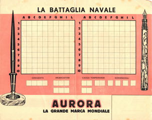 Scanning of advertising from Aurora dated 1931. Retouched by the author for a better sharpness. Guess date, from showed models, stands for the beginning of '30s. Brochure advertising the new Internazionale model. Back with a naval battle game, showing a desk pen and a Duplex model. On the other side of File:193x-Aurora-InternazionaleEtAl-Fronte.jpg.