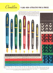 Scansione di una pagina di catalogo datata 1938. Pubblicazione su: Aisenstein and Gordon Catalog. Ritoccata dall'autore per una migliore nitidezza. Data indicata dal fornitore. Pubblicizza il modello Nozac della Conklin, nella variante a V soprapposte denominata V-line. e cita il pennino Cushon Point. Indica i colori: Black, Grey, Red, Green, Blue. Sull'altro lato di File:1938-Conklin-Nozac-Rear.jpg.