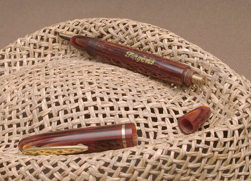 Photo of a pen produced by Surgens. Filling system: button filler. In striated brown celluloid. Unknown model.