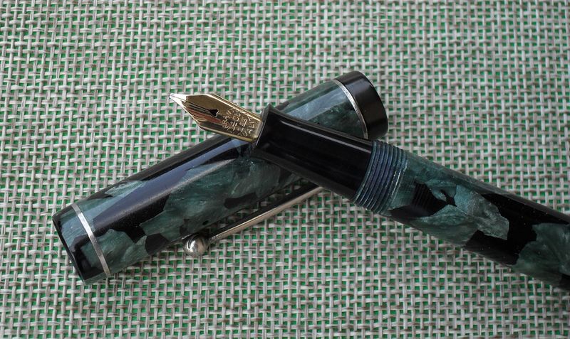Photo of a pen produced by Summit (a Lang - Curzon - Summit trademark). Model: Summit S.65. Filling system: lever filler. In marbled blue celluloid. Second version of the model (called mk2).