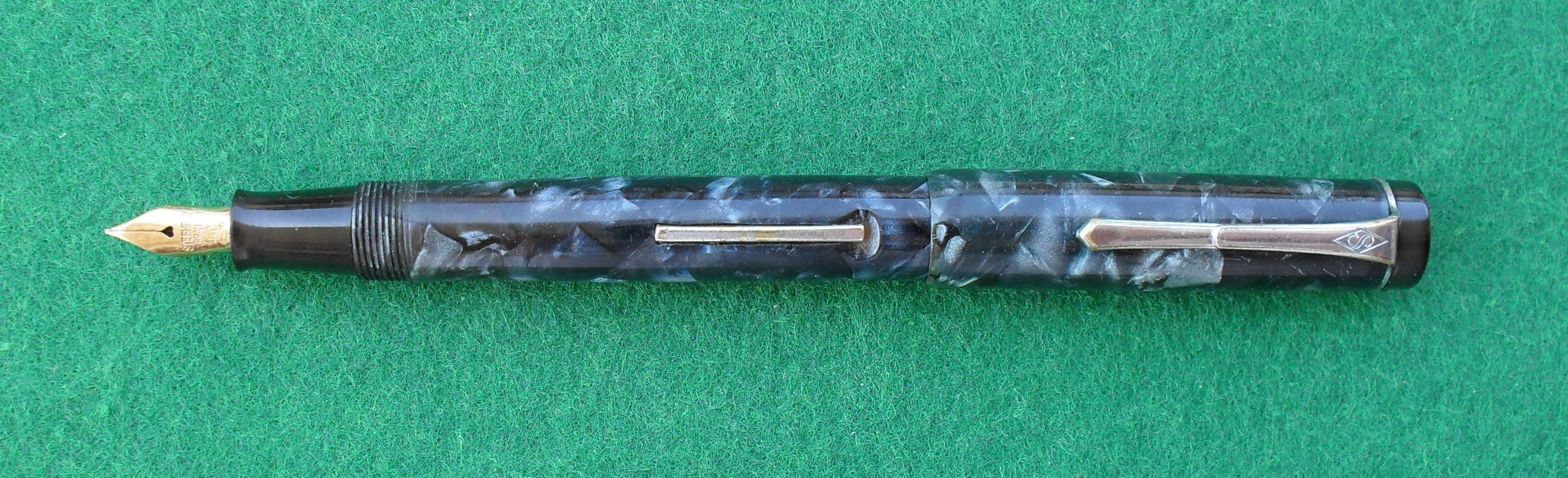 Photo of a pen produced by Stephens. Model: Stephens Leverfill 56. Filling system: lever filler. In blue/black marbled celluloid.