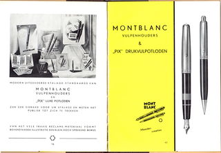 Scansione di una pagina di catalogo datata 1954-05. Pubblicato da "D. Blazer & Metz N.V.". Ritoccata dall'autore per una migliore nitidezza. Data riportata su un'altra pagina. Per penne a sfera Biro e stilografiche e matite meccaniche Montblanc. Pagine 16 e 17. Illustra il materiale pubblicitario ed una 644.
