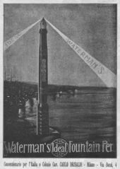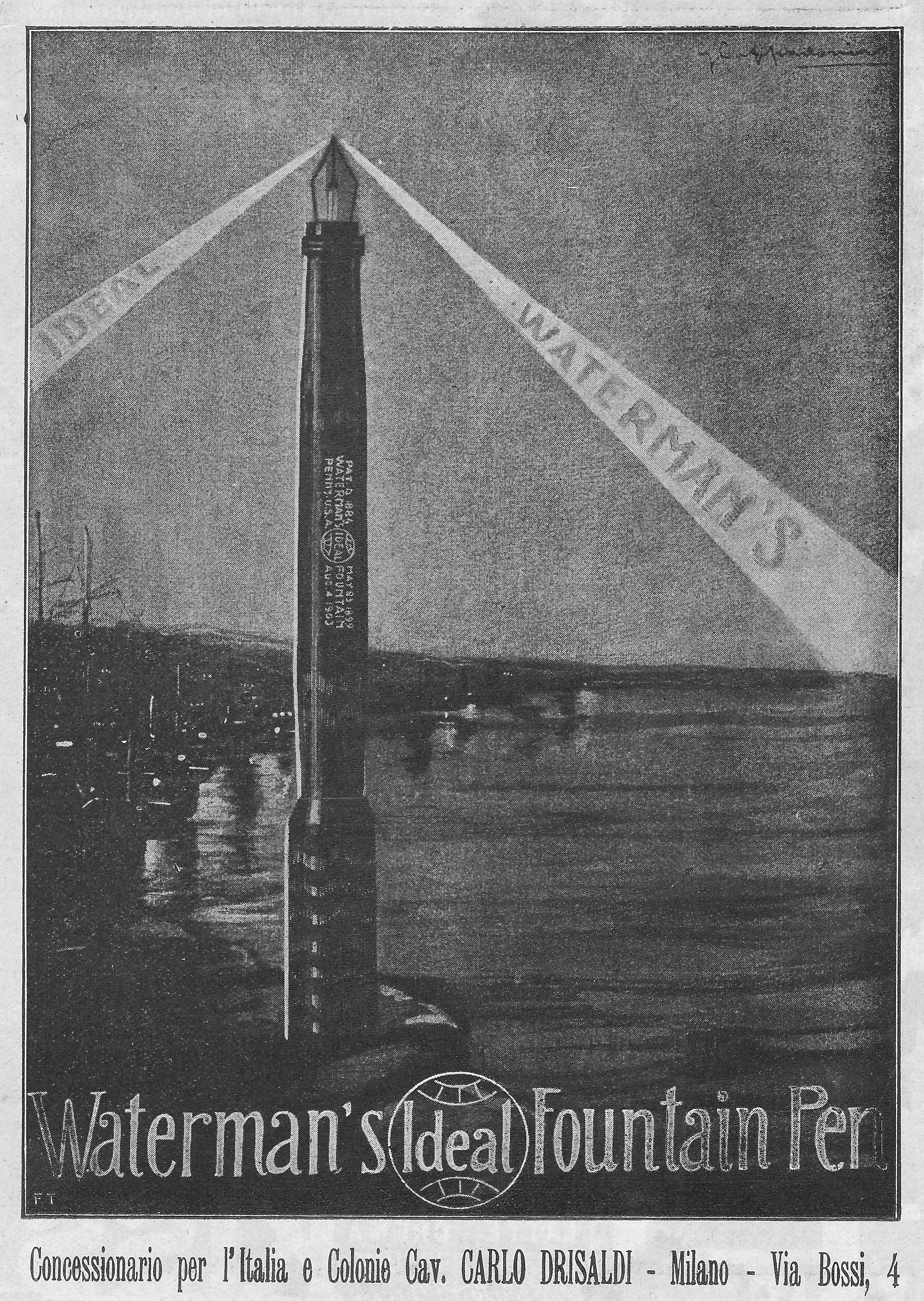 <multilang> @it|Scansione di una pubblicità Waterman del 1919 per un modello safety. Ritoccata dall'autore per una maggiore nitidezza. Data incerca, sicuramente posteriore al 1914, data in cui Drisaldi assunse la rappresentanza per l'Italia della Waterman. @en|Scanning of a 1919 Waterman advertising for a safety model. Retouched by the author for a better sharpness. </multilang>