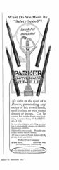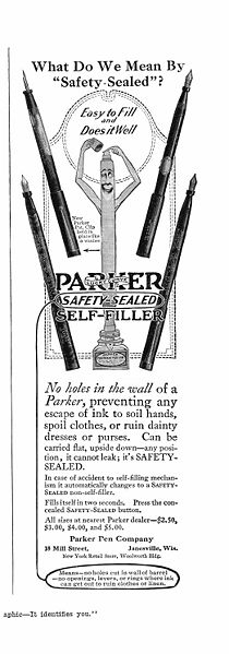 Scanning of advertising from Parker dated 1917-03. Published on: The National Geographic. Retouched by the author for a better sharpness. Dating given by the provider. Advertising for a Parker Lucky Curve model illustrating the button filler merits, the absence of opening for ink exit (called Safety-Sealed) and the new washer clip.