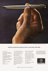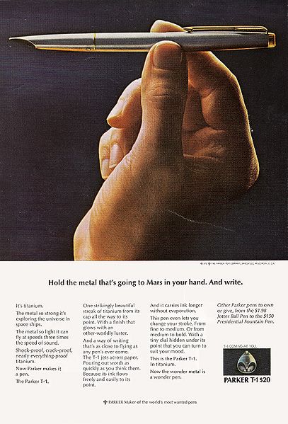 Scansione di una pubblicità Parker datata 1970. Ritoccata dall'autore per una migliore nitidezza. Data dalla nota di copyright. Pubblicizza il modello Parker T1.