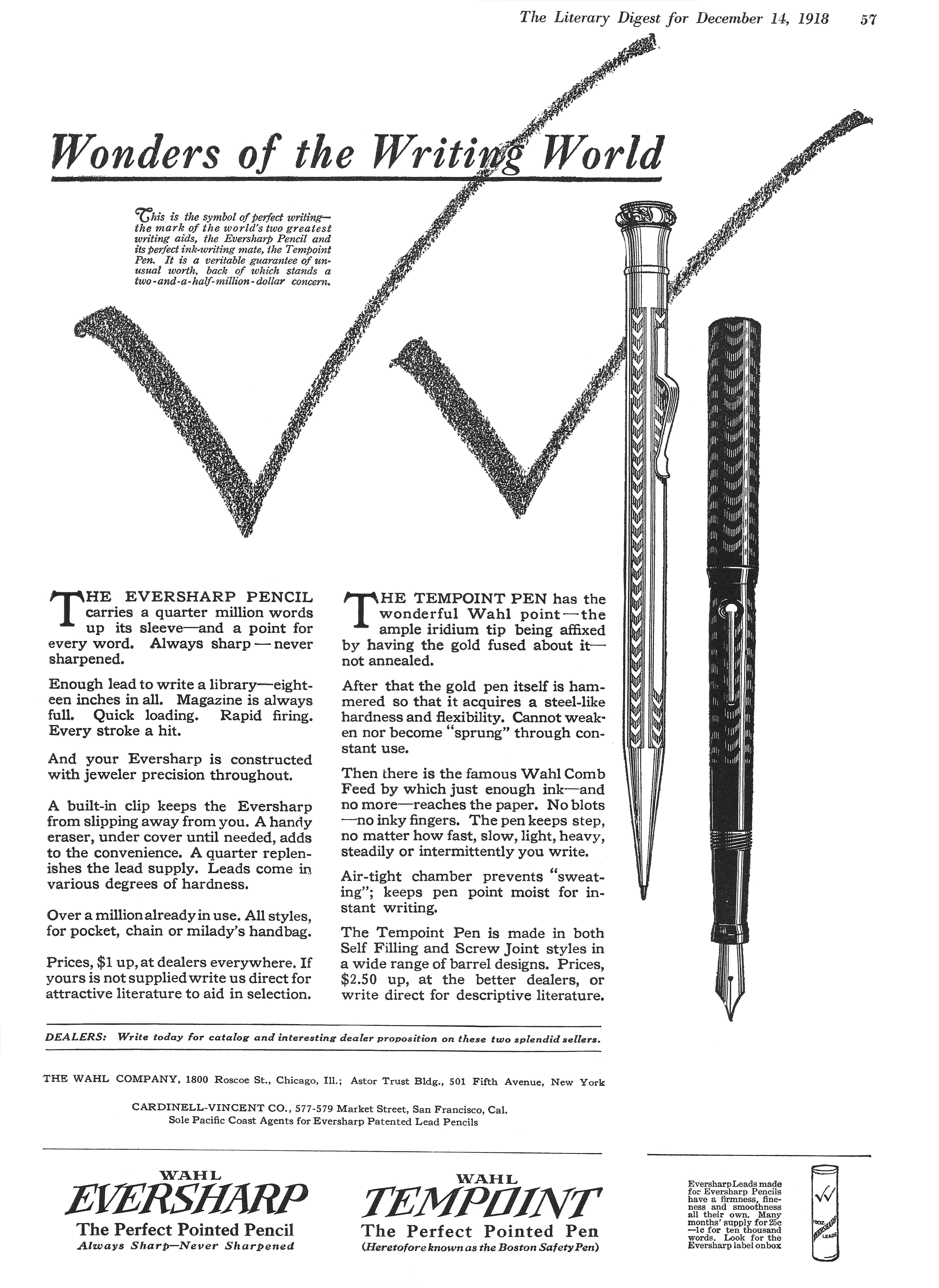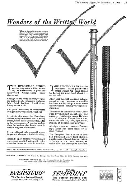 <multilang> @it|Scansione di una pubblicità Eversharp del Dicembre 1918 per una matita ed la stilografica Tempoint. Pubblicata sul Literary Digest. Ritoccata dall'autore per una migliore nitidezza. @en|Scanning of a December 1918 Eversharp advertising for a pencil and the Tempoint model. Published on Literary Digest. Retouched by the author for a better sharpness. </multilang>