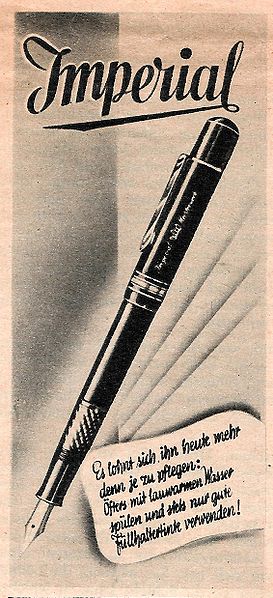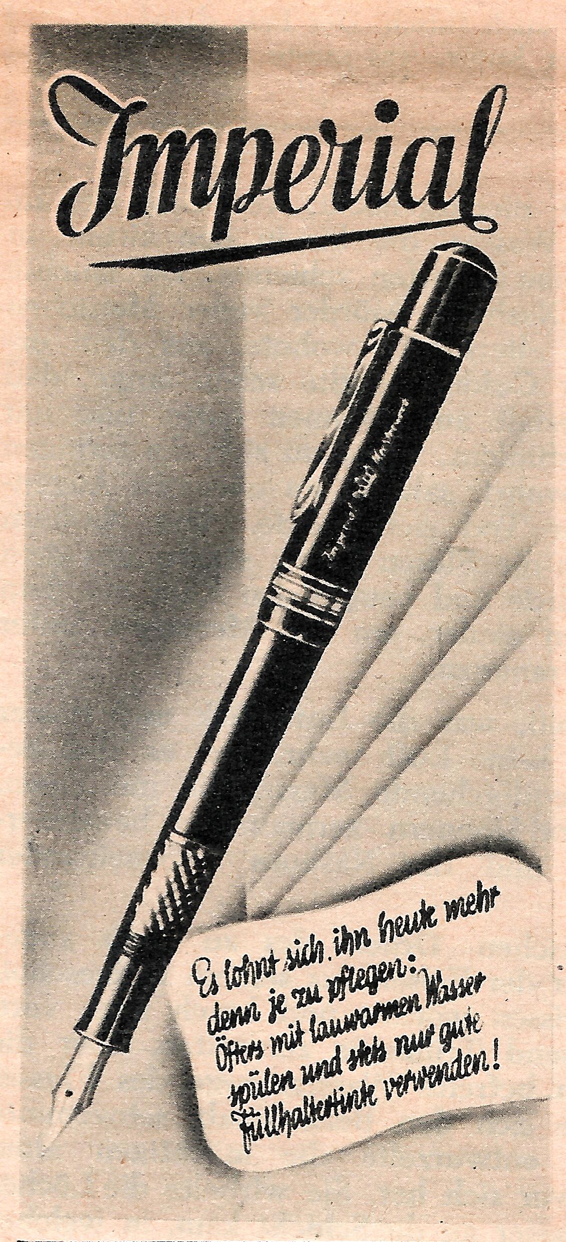Scansione di una pubblicità Imperial datata 1943-03. Pubblicazione su: Das Illustrierte Blatt. Ritoccata dall'autore per una migliore nitidezza. Data indicata dal fornitore, affidabile. Pubblicizza un modello non precisato della ditta.