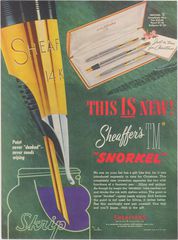 Scanning of advertising from Sheaffer dated 1952-12-01. Published on: Life. Retouched by the author for a better sharpness. Dating established by finding the page on Google Books. Advertising for a Snorkel Pen still named as Thin Model in a pen/ball/pencil set, Sentinel version. Explaining also the new snorkel filler. Mention the "White dot of distintion".