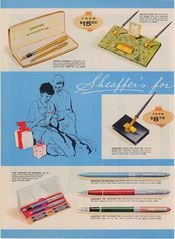 Scansione di una pubblicità Sheaffer datata 1957-12-09. Pubblicazione su: Life. Ritoccata dall'autore per una migliore nitidezza. Data ottenuta dal reperimento della pagina su Google Books. Pagina sinistra. Pubblicizza una serie di modelli del tempo, a partire da varie versioni di Snorkel Pen, (Valiant, Sentinel, Admiral, Statesman, Sovereign, Triumph) e vari modelli a cartuccia Sheaffer Cartridge Pen (set 495, 295, 500, 875).