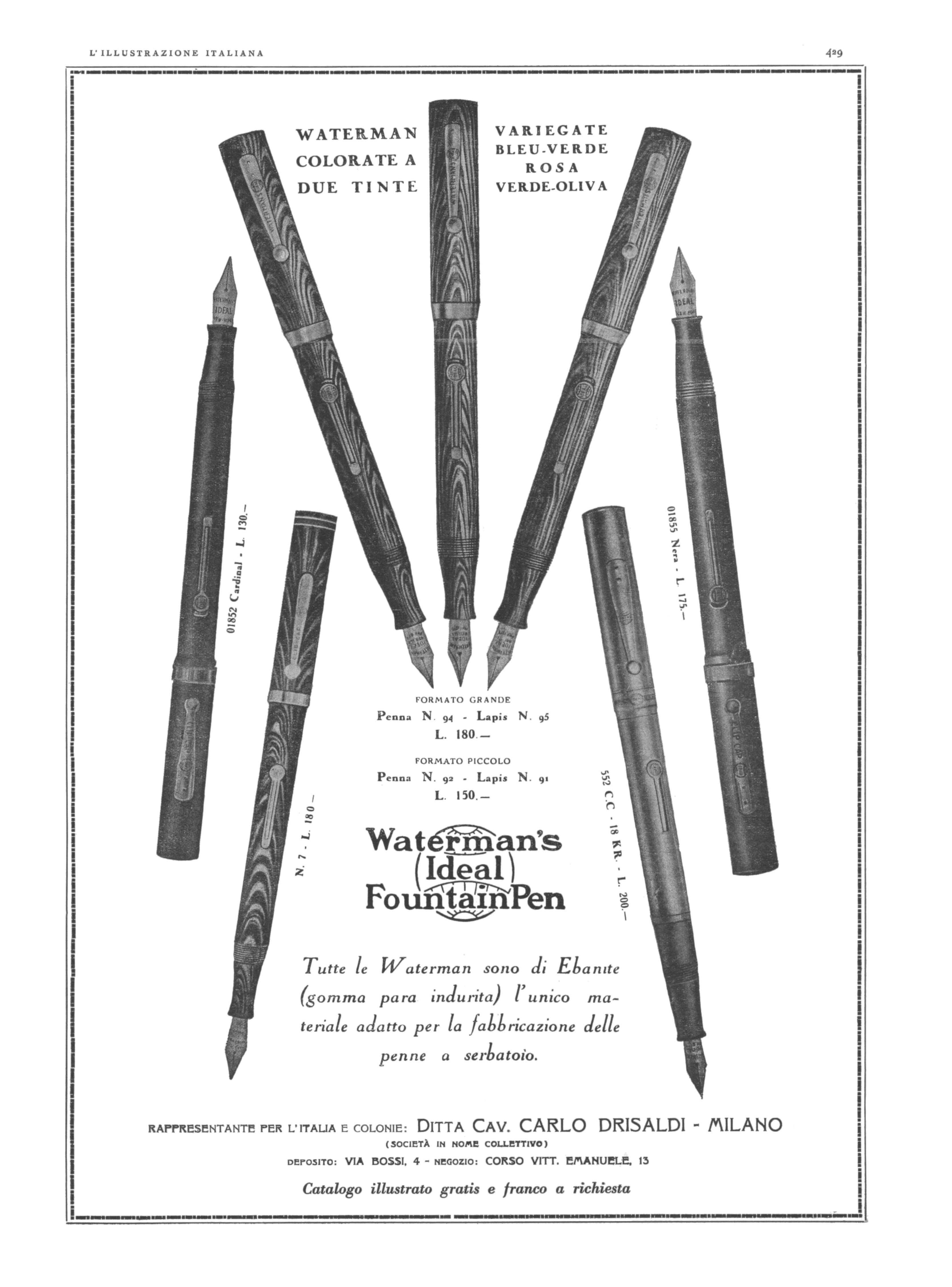 Scansione di una pubblicità Waterman datata 1929-03-17. Pubblicazione su: L'Illustrazione Italiana, anno LVI, n. 11. Ritoccata dall'autore per una migliore nitidezza. Contributo di Armando Dabbene (utente forum fountainpen.it A Dabbene). Data dal reperimento della pagina su una versione archiviata della rivista. Pubblicato anche sul Suppl. N. 15 (1929-04-12). Pubblicizza i modelli di quel periodo: 94 e 92 in ebanite colorata, Ripple No. 7, 52 in ebanite rossa Cardinal, 55 ordinaria e 552 rivestita in oro massiccio.