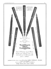 Scanning of advertising from Waterman dated 1929-03-17. Published on: L'Illustrazione Italiana, year LVI, n. 11. Retouched by the author for a better sharpness. Dating established by finding the page in an archived version of the magazine. Published also on Suppl. N. 15 (1929-04-12). Advertising for the models of that time: 94 and 92 in colored rippled hard rubber, Ripple No. 7, Waterman 52 in Cardinal red, ordinary Waterman 55, a full gold overlay Waterman 552.