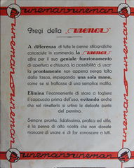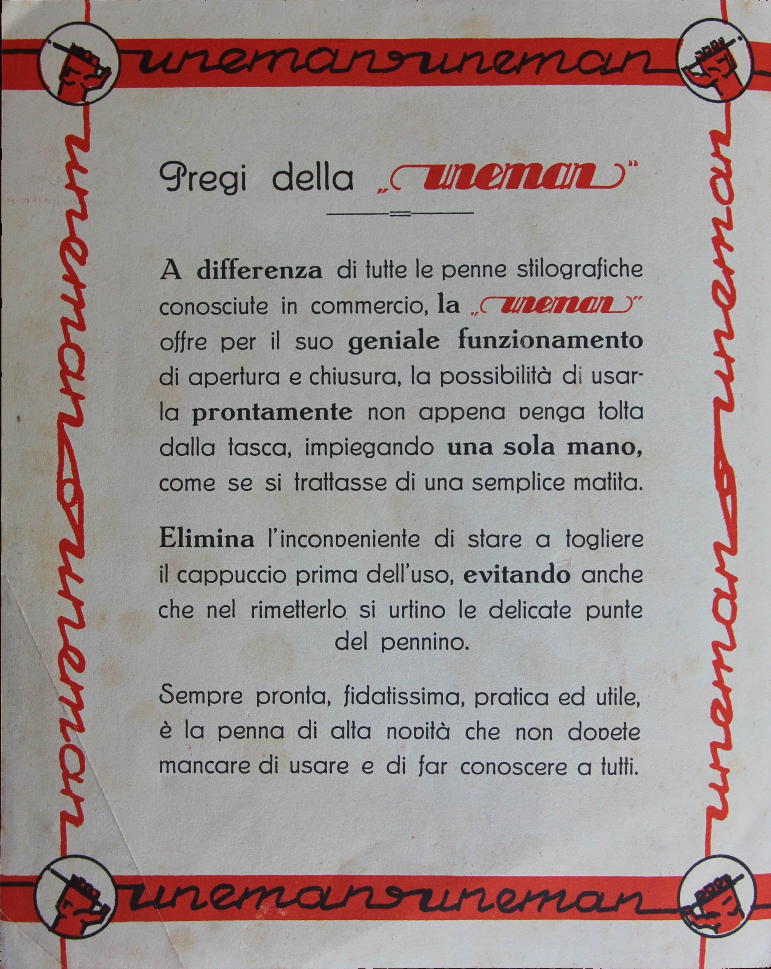 Scansione di una brochure Uneman datata 1932. Ritoccata dall'autore per una migliore nitidezza. Data indicativa, dal periodo del modello, sta per l'inizio degli anni 30. Pubblicizza la penna Uneman. Sull'altro lato di File:193x-Uneman-Brochure-p01.jpg.