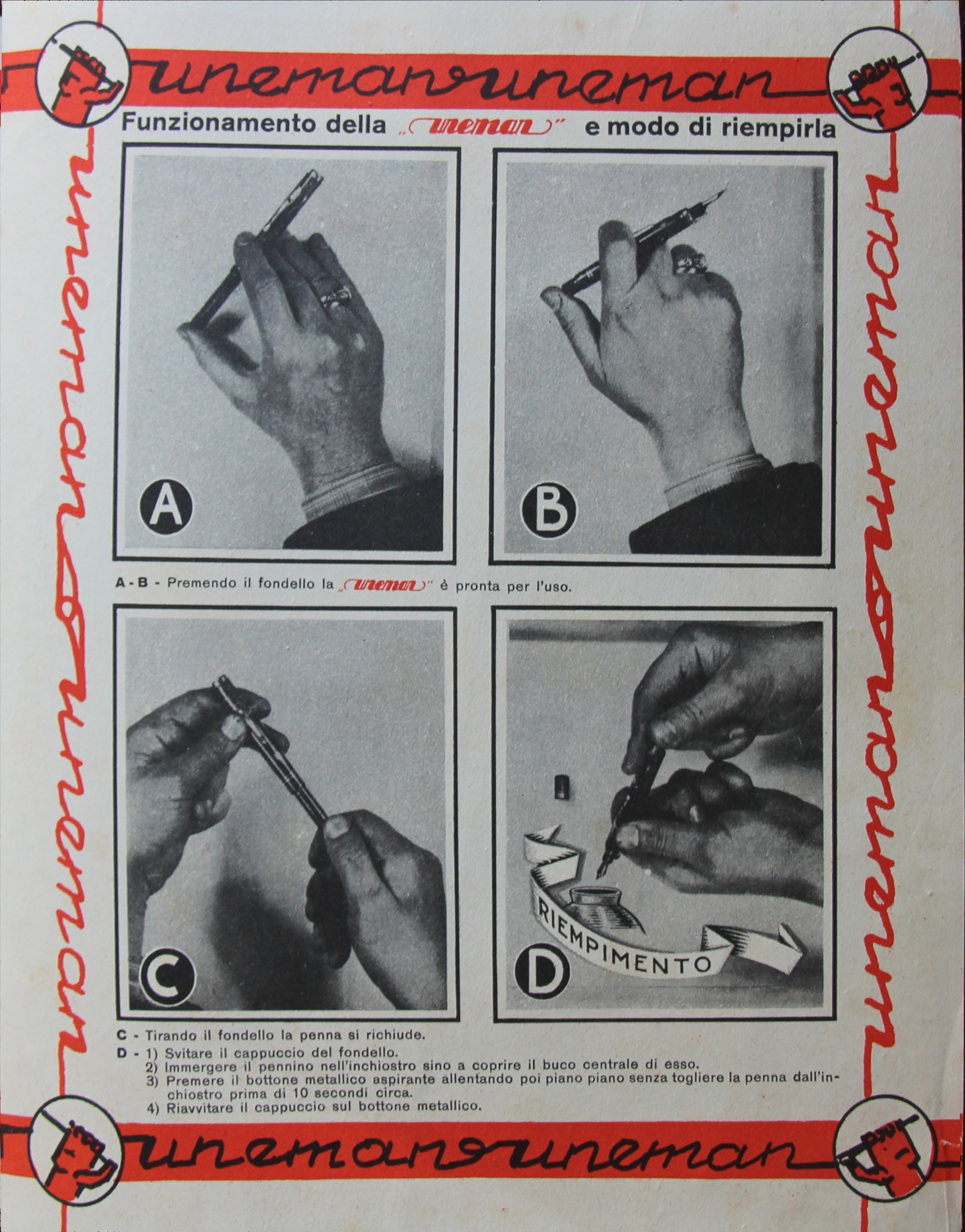 Scansione di una brochure Uneman datata 1932. Ritoccata dall'autore per una migliore nitidezza. Data indicativa, dal periodo del modello, sta per l'inizio degli anni 30. Pubblicizza la penna Uneman. Terza pagina. Sull'altro lato di File:193x-Uneman-Brochure-p01.jpg.