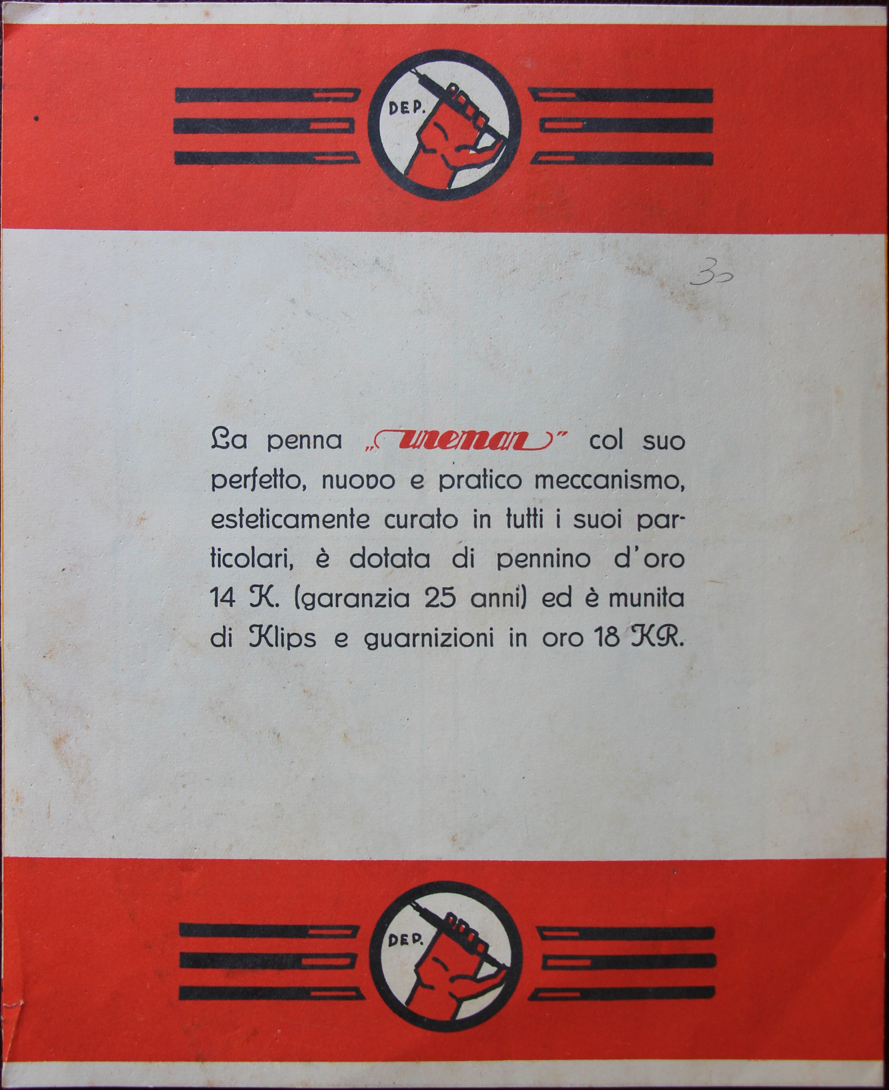 Scanning of a brochure from Uneman dated 1932. Retouched by the author for a better sharpness. Guess date, from the model time, stand for beginning of 30s. Advertising for the Uneman pen. Fourth page. On the other side of File:193x-Uneman-Brochure-p03.jpg.