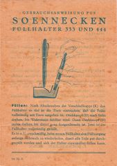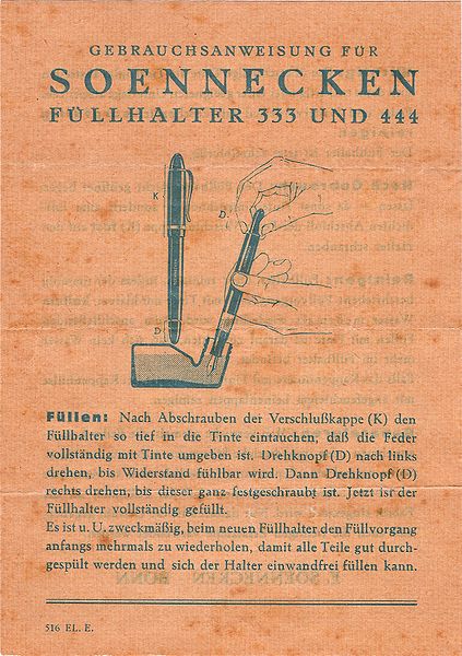Scansione di un foglietto di istruzioni Soennecken degli anni '40. Relativo ad un modello Soennecken 444. Fronte. Valido anche per il modello 333. Sull'altro lato di File:Soennecken-333-444-Instr-Back.jpg. Ritoccata dall'autore per una migliore nitidezza. Da una confezione originale.