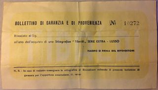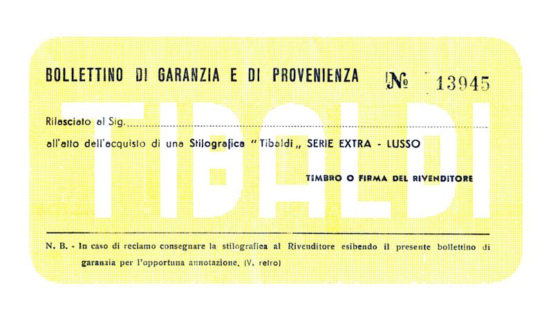 Scanning of a Tibaldi a warranty from '40s. For a Tibaldi Extra Lusso model. Front. On the other side of File:Tibaldi-Extra-Lusso-Back.jpg. Retouched by the author for a better sharpness. Contributed by Massimo, utente forum Maxpen2012. From an original package.