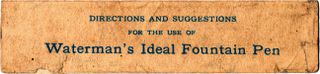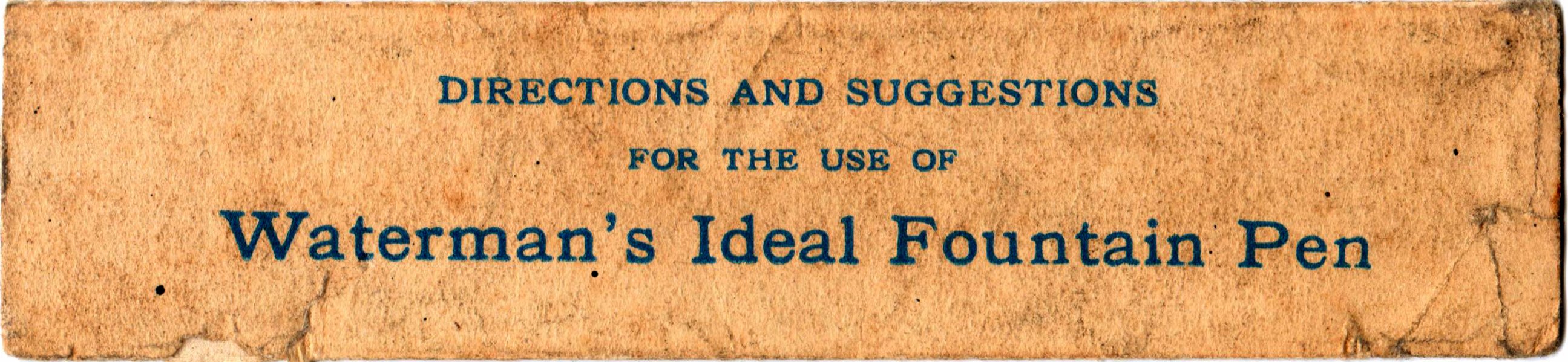 Scansione di una bustina di protezione Waterman degli anni '10. Relativo ad un modello Waterman 5x. Bustina protettiva per le istruzioni. Poco dopo il 1917 comparendo la nuova numerazione insieme alla vecchia. Per i principali modelli di quel periodo: a levetta, safety e a caduta. Ritoccata dall'autore per una migliore nitidezza.