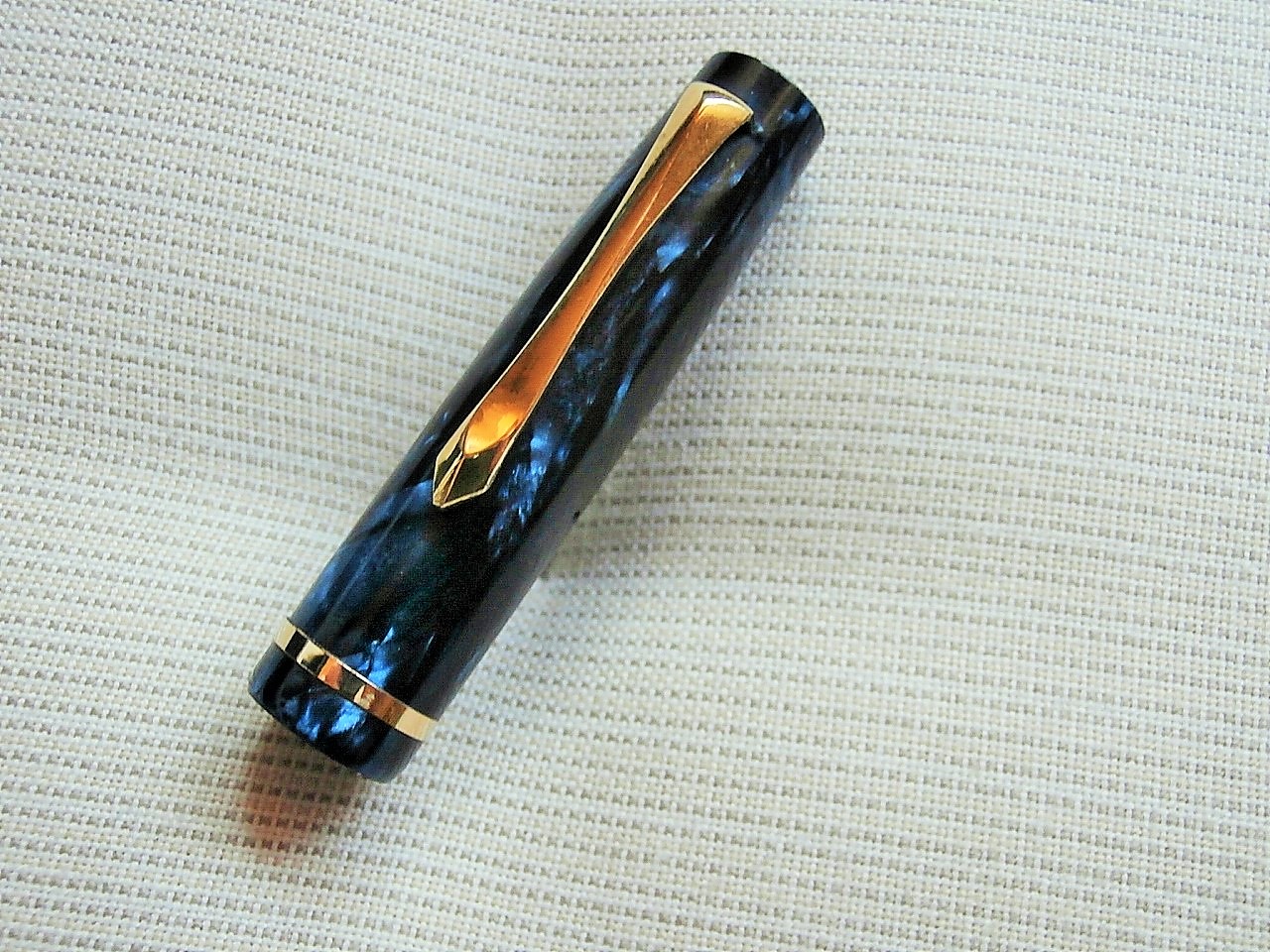 Foto di una penna Stilnova (un marchio della Pagliero). Modello: Stilnova Extra. Caricamento a levetta. Realizzazione in celluloide blu. Contributo di Fabrizio Falchi, (utente forum fountainpen.it fab66).