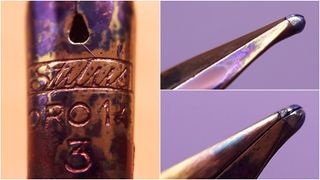 Foto di una penna Stilus. Modello: Stilus 413. Caricamento rientrante. Realizzazione in ebanite nera cesellata. Dettaglio del pennino. Contributo di Giorgio (utente forum Musicus).