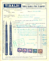 Scanning of an invoice from Tibaldi dated 1933-05-11. Date directly visible. Refers to Tibaldi 26 and some unidentified pens with "warranted" nib. From the original document. Retouched by the author for a better sharpness.