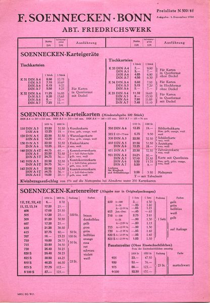 Scansione di un listino Soennecken datata 1950-12. Data visibile direttamente. Primo foglio, fronte. Per materiale di cancelleria. Dal documento originale Sull'altro lato di File:Soennecken-Pricelist-1950-12-Sheet01-Bk.jpg. Ritoccata dall'autore per una migliore nitidezza.