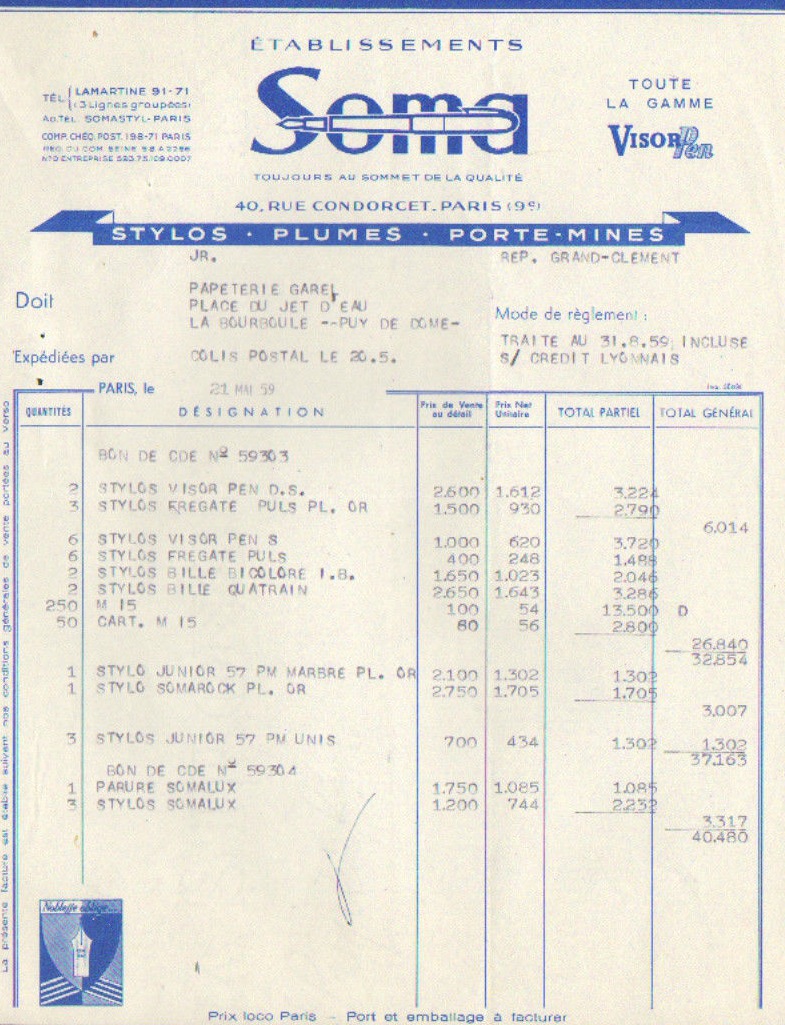 Scansione di una fattura Soma datata 1959-05-21. Data visibile direttamente. Fa riferimento ai modelli Visor Pen, Fregate Puls, Junior 57. Ritoccata dall'autore per una migliore nitidezza. Contributo di Massimo, utente forum Maxpen2012.