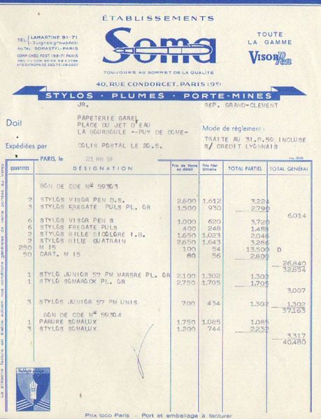 Scanning of an invoice from Soma dated 1959-05-21. Date directly visible. Refers to models Visor Pen, Fregate Puls, Junior 57. Retouched by the author for a better sharpness.