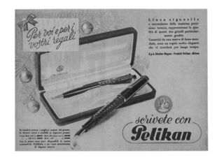 Scanning of advertising from Pelikan dated 1952-01. Published on: Le vie d'Italia - Rivista mensile del Touring Club Italiano, year LVIII, n. 1. Retouched by the author for a better sharpness. Dating established by finding the page in an archived version of the magazine. Advertising for the Pelikan 400. Mention the Pelikan 100N, Ibis 130 and Pelikan 500 models.
