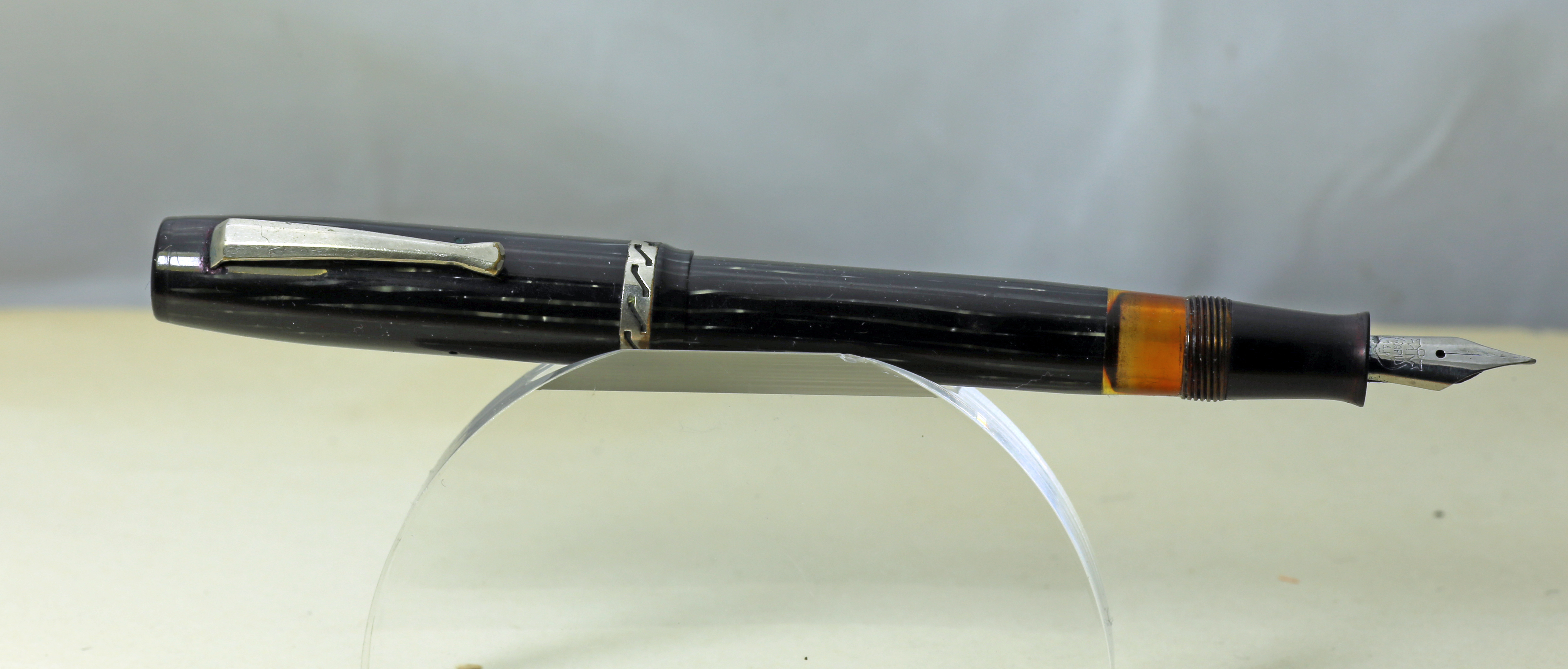 Foto di una penna Astura Trasparente. Caricamento a pulsante di fondo. Realizzazione in celluloide rigata verde. Versione con finestrella di visualizzazione dell'inchiostro. Contributo di Stefano (utente forum netosaf).