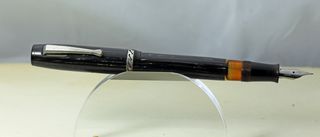 Photo of a pen produced by Astura Trasparente. Filling system: button filler. In green lined celluloid. Version with ink level view window.