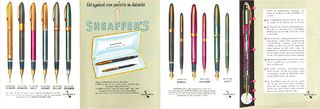 Scansione di una pubblicità Sheaffer datata 1952. Ritoccata dall'autore per una migliore nitidezza. Data indicativa, dalla data di introduzione del modello illustrato. Pubblicizza le varianti della Snorkel Pen (Sheaffer Triumph, Sheaffer Autograph, Sheaffer Crest, Sheaffer Sentinel, Sheaffer Valiant, Sheaffer Statesman, Sheaffer Admiral, Sheaffer Craftsman e Sheaffer Cadet), insieme a varie matite meccaniche e stilofori, inchiostri e sfere. Menziona il TIPDip. Sull'altro lato di File:195x-Sheaffer-Snorkel-Brochure-Ext.jpg.