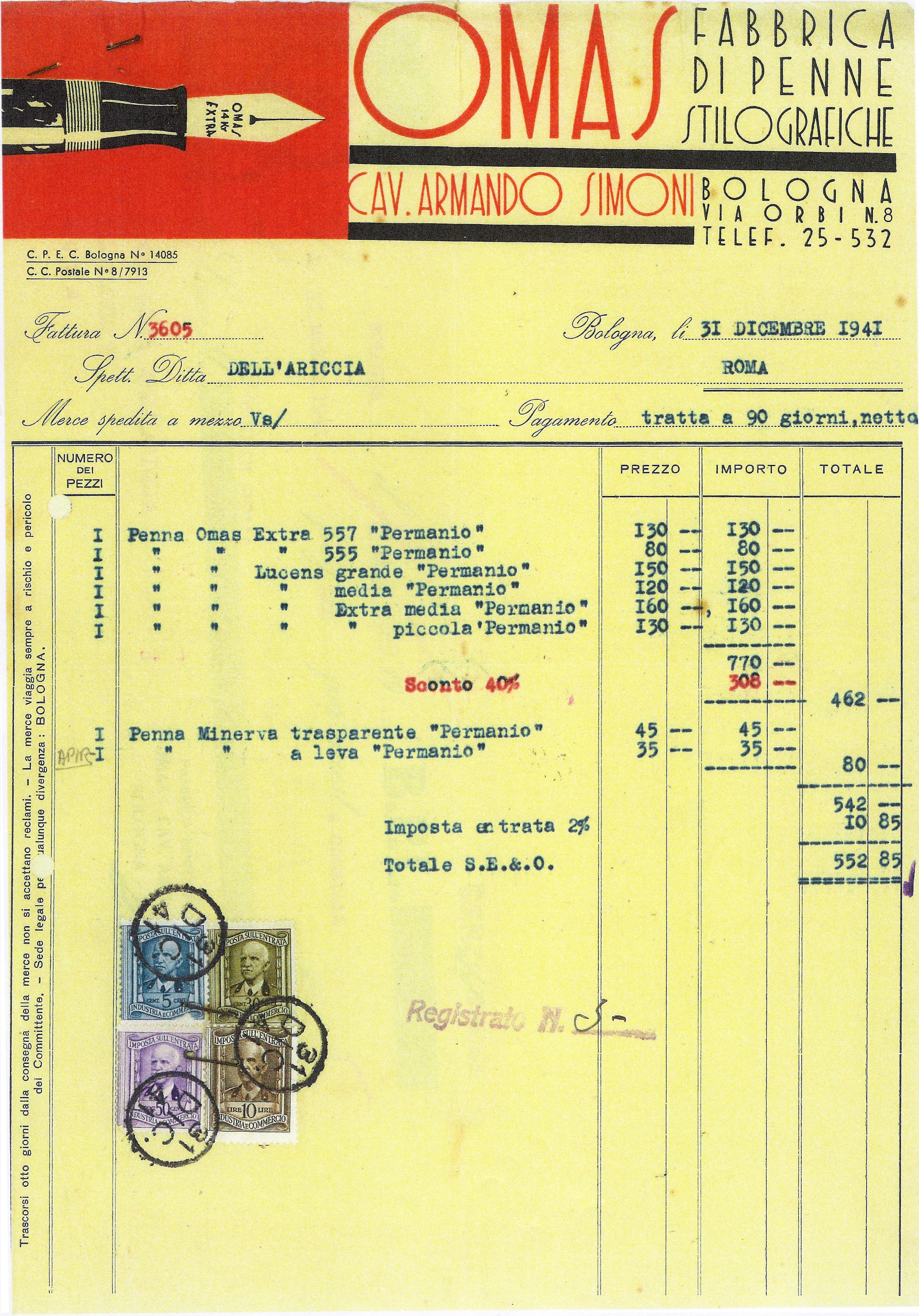 Scansione di una fattura Omas datata 1941-12-31. Data visibile direttamente. Fa riferimento ai modelli: Omas 555, Omas 557, Lucens e Extra Lucens per la Omas e a due non meglio precisate Minerva, una trasparente ed una a leva. Contributo di Francesco Gargiulo Cita come indirizzo: "Via Orbi, 9 - Bologna". Ritoccata dall'autore per una migliore nitidezza.