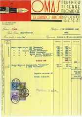 Scanning of an invoice from Omas dated 1941-12-31. Date directly visible. Refers to Omas 555, Omas 557, Lucens, and Extra Lucens models and to two undefined Minerva pens called trasparente (transparent) and a leva (lever filled). Courtesy of Francesco Gargiulo. Mention as address: "Via Orbi, 9 - Bologna". Retouched by the author for a better sharpness.