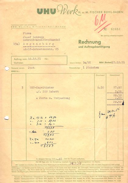 Scansione di una fattura Uhu datata 1951-12-17. Data visibile direttamente. Per il modello (?) Kugeltinter. Dal documento originale Cita come indirizzo: "Fisher Bühl - Baden". Ritoccata dall'autore per una migliore nitidezza.