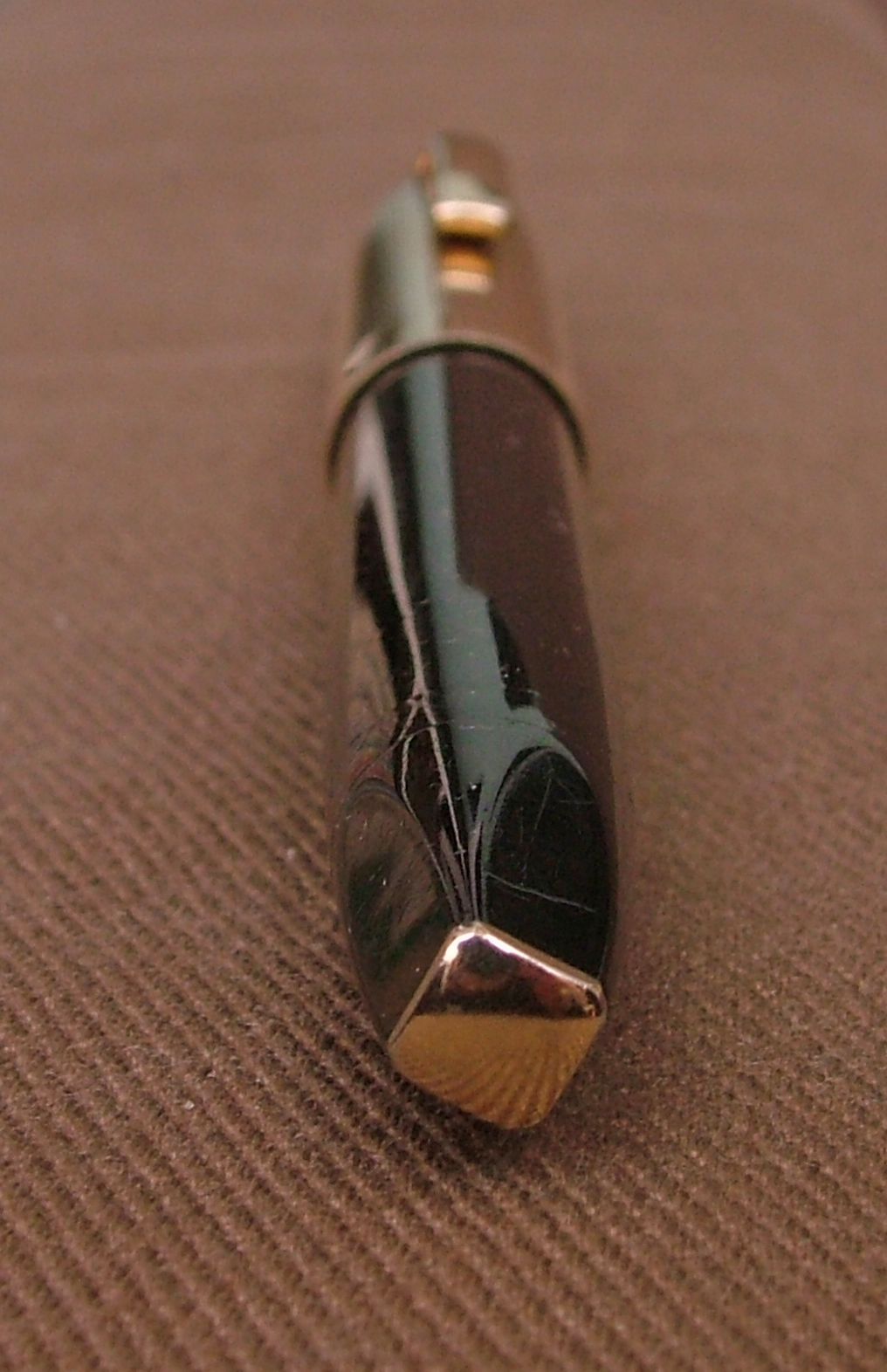 Photo of a pen produced by Sheaffer. Model: Sheaffer PFM. Filling system: "Touch Down snorkel". In black plastic resin. Detail of bottom. Model PFM-V.