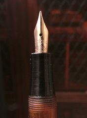 Photo of a pen produced by Imperial. Model: Imperial Privat. Filling system: piston filler. In black and marbled green celluloid. Detail of nib. Rare barrel colored version. Not original nib.