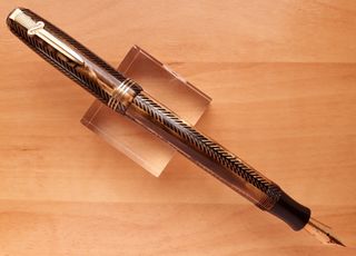 Photo of a pen produced by Parker. Model: Royal Challenger. Filling system: button filler. In brown celluloid. Sword clip version, standard size (big).