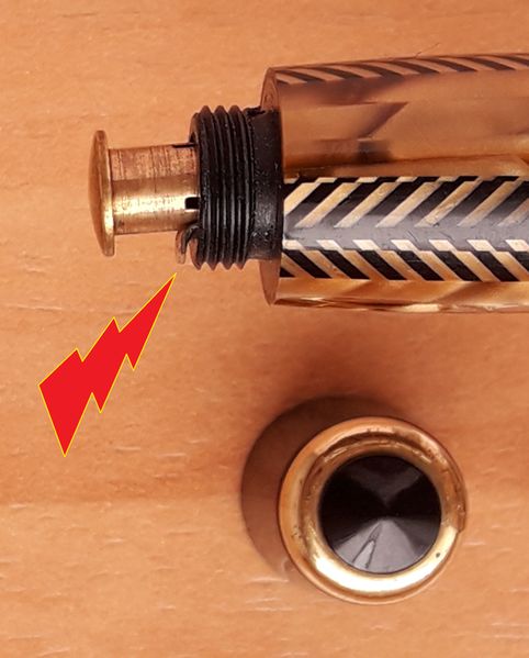 Photo of a pen produced by Parker. Model: Royal Challenger. Filling system: button filler. In brown celluloid. Detail of filling system. Sword clip version, standard size (big).