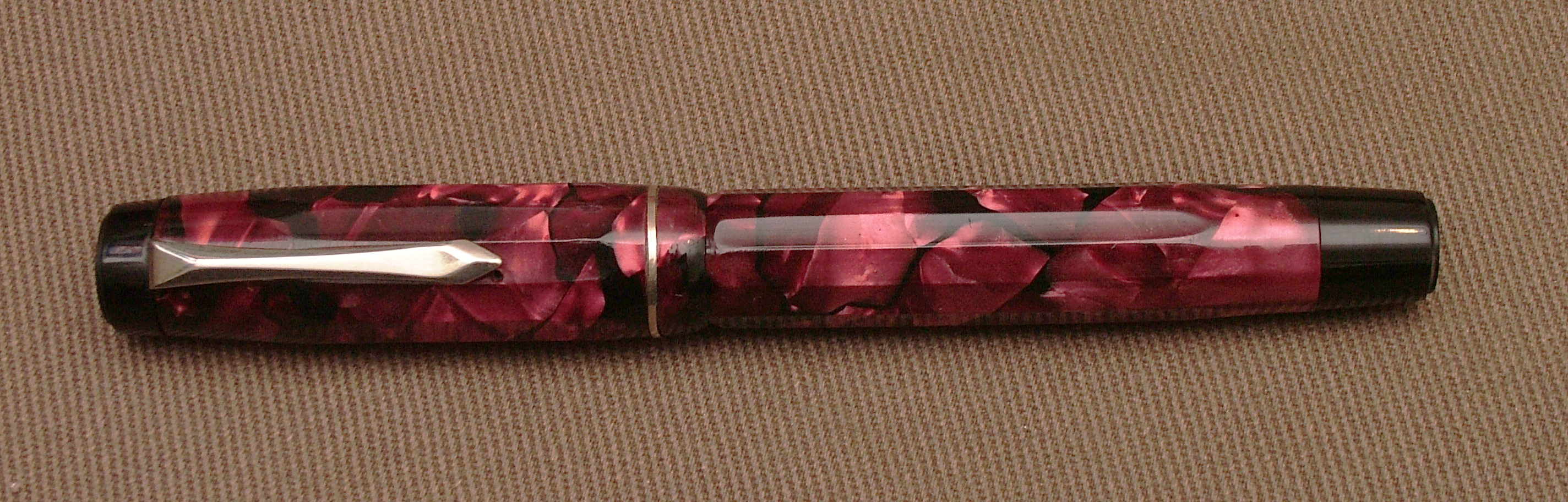 Photo of a pen produced by Olo (sub-band of Fabbrica Italiana Penne a Serbatoio Aurora). Model: Olo F23. Filling system: button filler. In faceted red marbled celluloid.