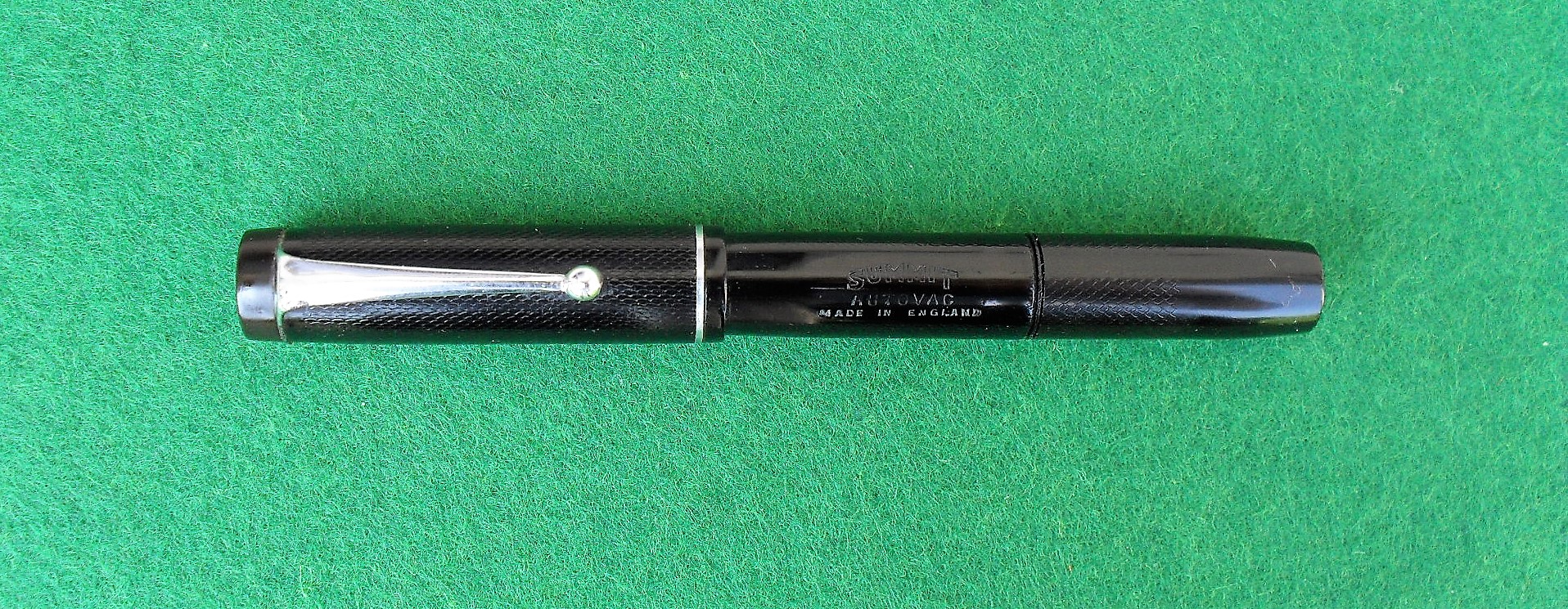 Photo of a pen produced by Summit (a Lang - Curzon - Summit trademark). Model: Summit Autovac. Filling system: pump filler. In black celluloid. Version V76, for its price, 7 shillings and 6 pence. There are imprints of nº GB-414929 patent.