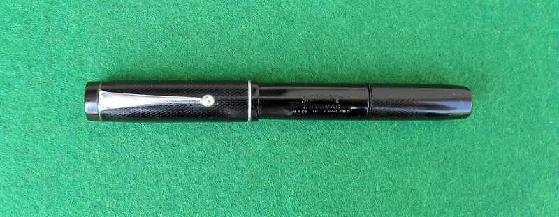 Foto di una penna Summit (un marchio della Lang - Curzon - Summit). Modello: Summit Autovac. Caricamento "pump filler". Realizzazione in celluloide nera. Versione V76, dal prezzo di 7 scellini e 6 pence. Riporta stampigliato il brevetto nº GB-414929. Contributo di Alberto (utente forum A Casirati).